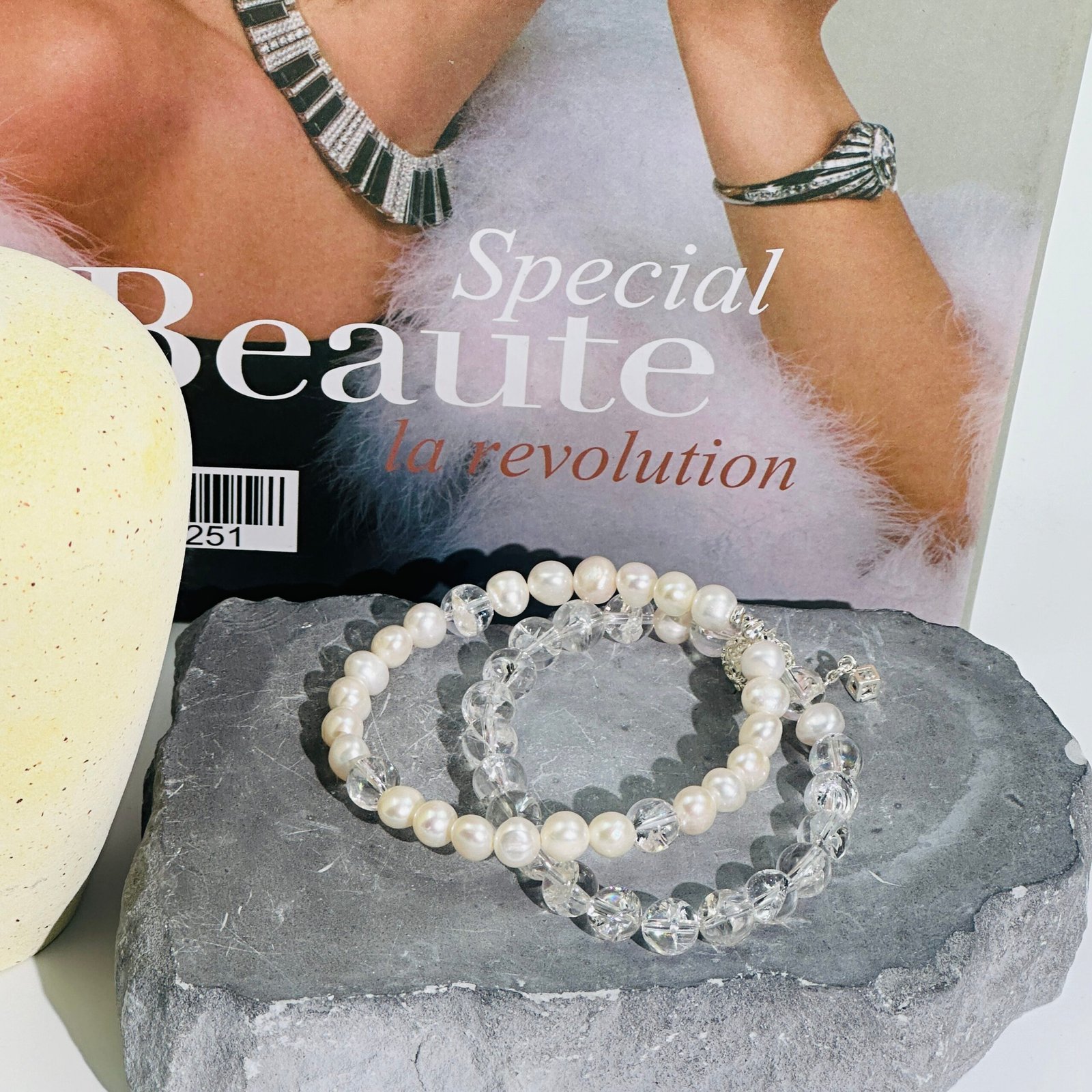 Designer bracelet made of natural white crystal.